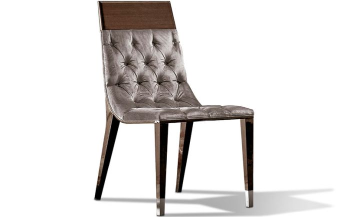 Стул со спинкой и сиденьем на пуговицах или без них. 2 передние ножки с хромированными ножками. Доступен в коже / из бархата или замши / из нубука.