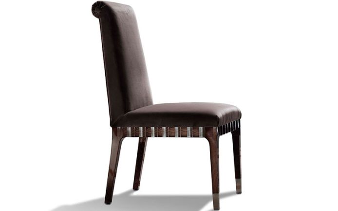 Стул с основанием из массива бука, спинкой и сиденьем из первоклассной кожи, нубука, бархата или замши. 2 передние ножки с хромированными ножками из нержавеющей стали.