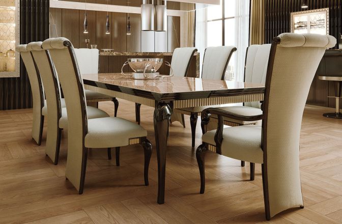 Столовая и кухня представляют собой единое уникальное пространство. Легко узнаваемый большой стол серии Manhattan, а также стулья и кресла серии Greta занимают центральную часть помещения. Благодаря отличному дизайну просторная кухня не бросается в глаза, а насладиться произведениями кулинарного искусства можно в изящной дегустационной зоне.