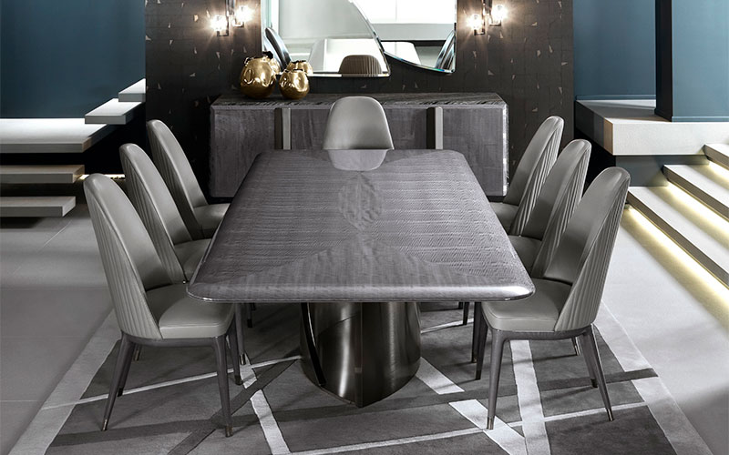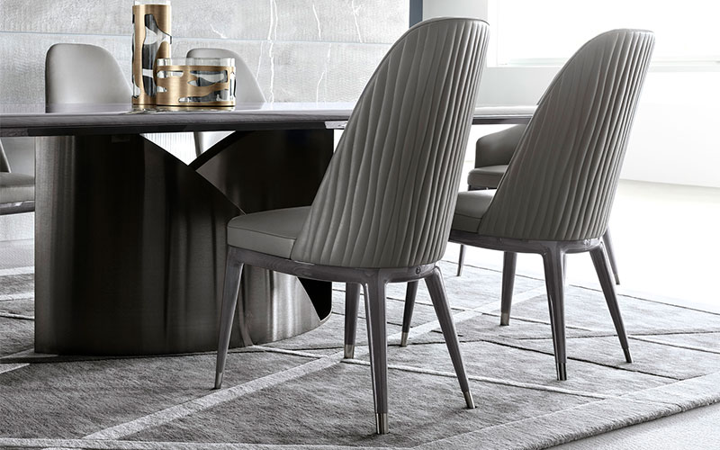 Полностью обитый стул из массива бука. Спинка из стеганой кожи первого сорта, нубука, кожи с тиснением под ящерицу, бархата или замши. Деревянное основание с логотипом Giorgio Collection. 4 ножки с деталями из сатинированной черной никелевой нержавеющей стали.