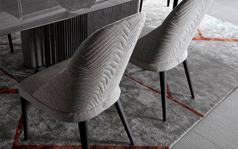 Полностью обитый стул из массива дуба. Спинка из стеганой кожи первого сорта, нубука, кожи с тиснением под ящерицу, бархата или замши. Мягкое основание с вышитым логотипом Giorgio Collection. 4 ножки из сатинированного дуба.