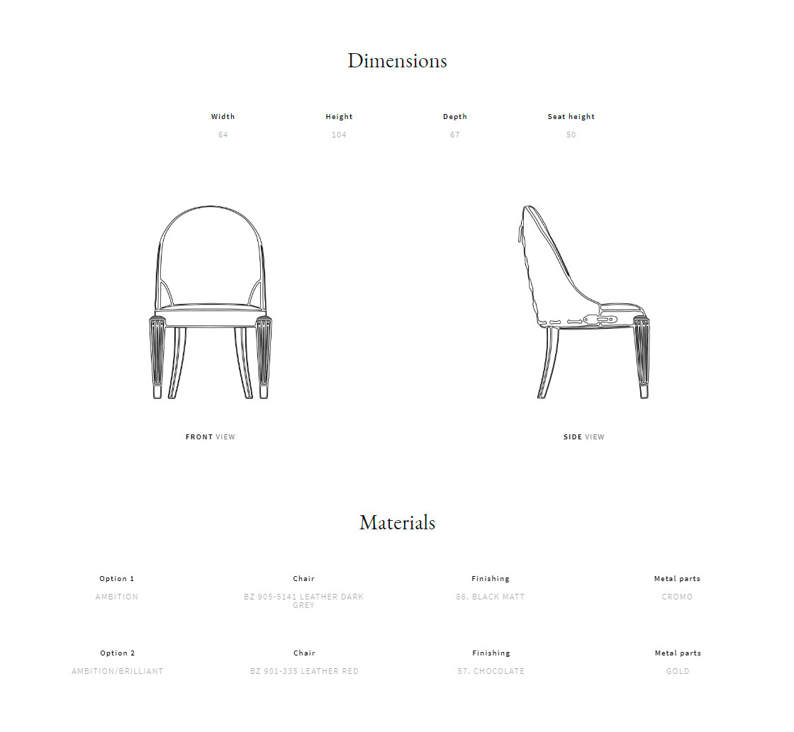 Рама из массива дерева. Передние ножки из бука с латунной отделкой. Стеганая внутренняя часть каркаса; отделка «корсет» внешнего каркаса. Набивка из пенополиуретана разной плотности.