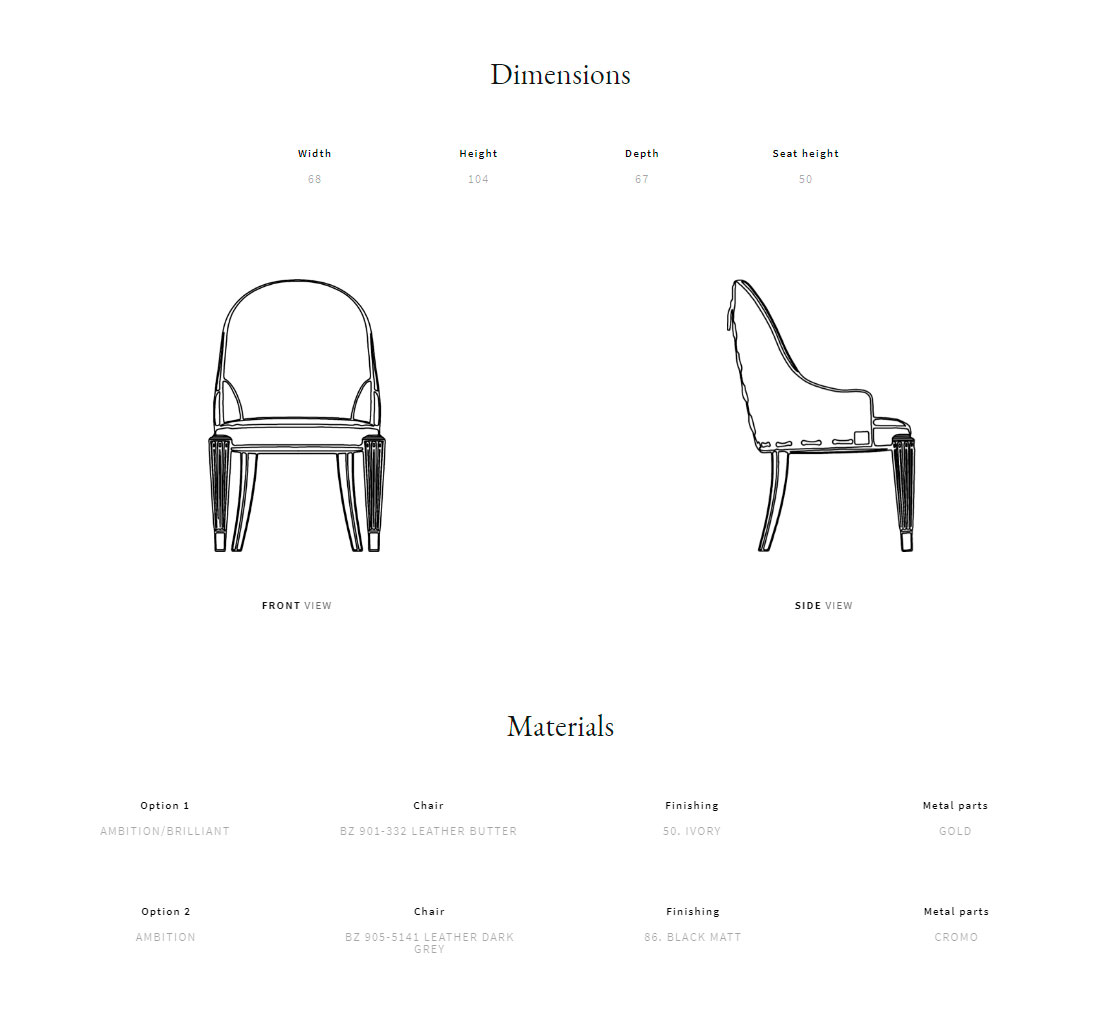 Рама из массива дерева. Передние ножки из бука с латунной отделкой. Стеганая внутренняя часть каркаса; отделка «корсет» внешнего каркаса. Набивка из пенополиуретана разной плотности.