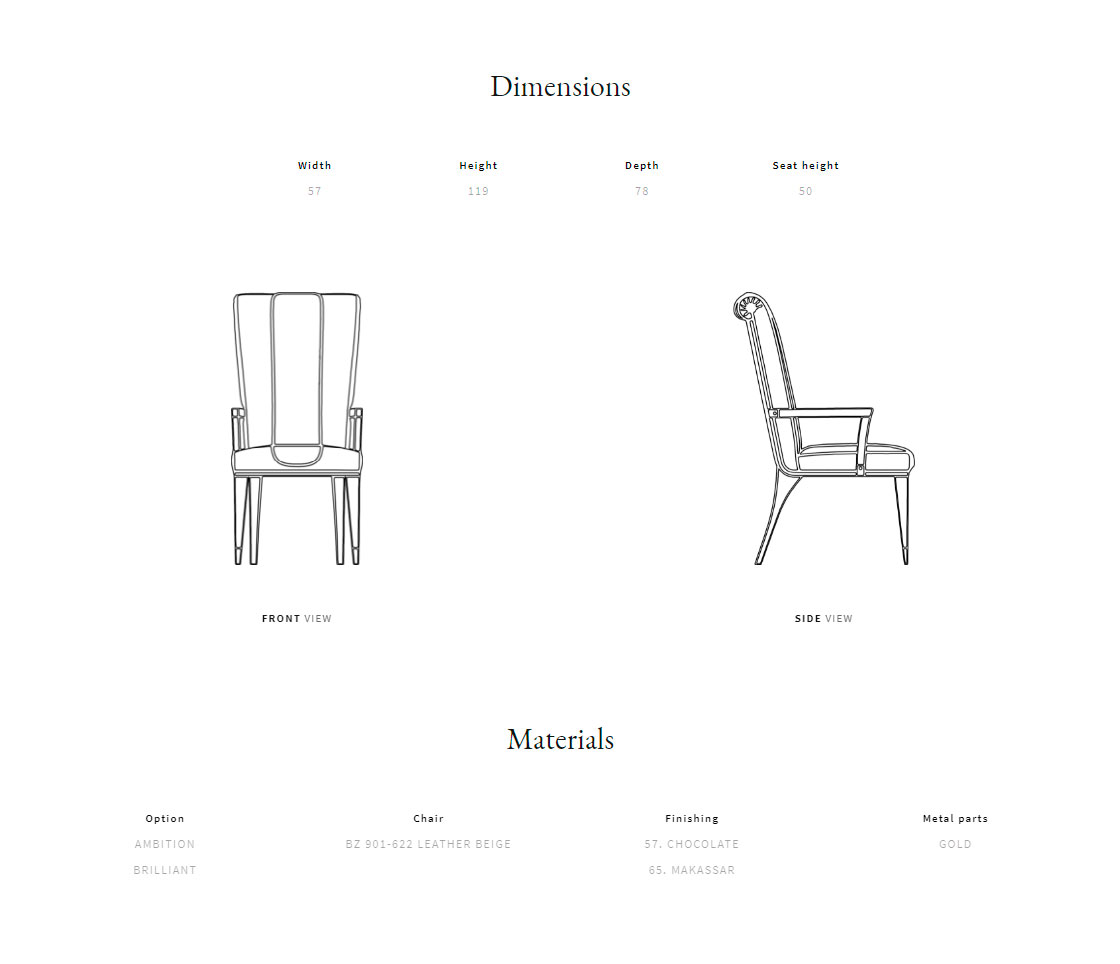 Рама из массива дерева и фанеры. Стеганая спинка и сиденье. Набивка из пенополиуретана разной плотности. Доступный материал: шпон макассарского эбена.