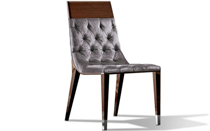Стул со спинкой и сиденьем на пуговицах или без них. 2 передние ножки с хромированными ножками. Доступен в коже / из бархата или замши / из нубука.