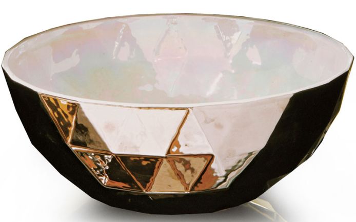 Художественная керамика с декоративным алмазным орнаментом из сусального золота или платины, нанесенных кистью; с тройной обработкой методом обжига. Внутренняя поверхность - белая.