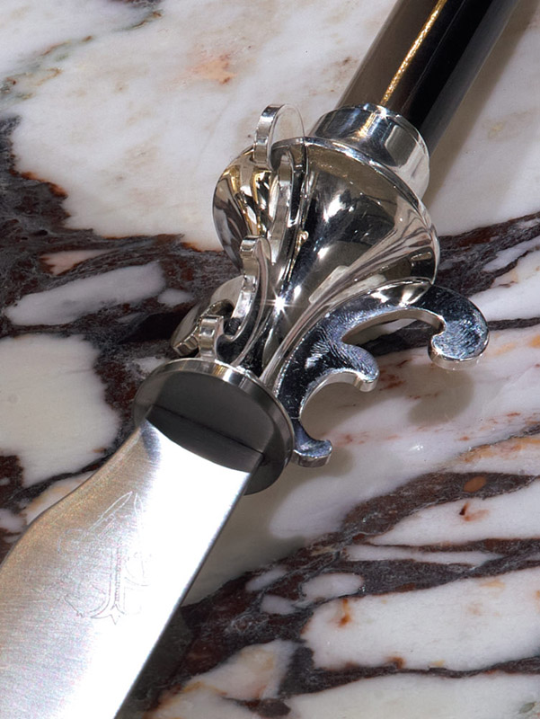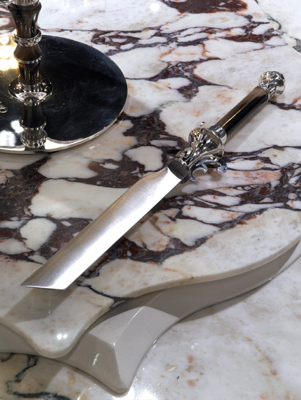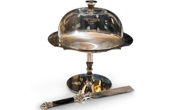 Ножка из рога и посеребренной латуни. Стеклянная крышка с латунной ручкой, с логотипом Visionnaire. Нож. Ручка из рога и посеребренной латуни или цельного серебра. Стальное лезвие.