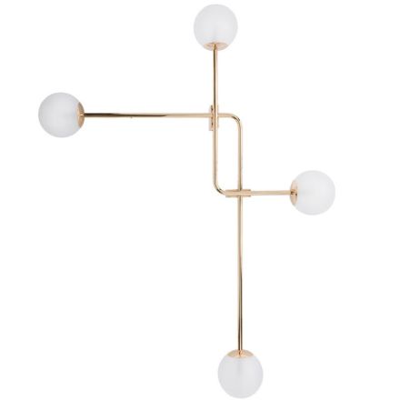 Настенный светильник со структурой из железных стержней цилиндрического сечения. Система крепления к стене из железа. Золотая отделка. Абажуры из натурального сатинированного стекла. Галогеновые лампочки.