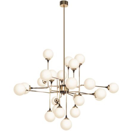 Люстра на 24 лампочки с латунной структурой с золотой отделкой. Абажуры из опалового стекла.