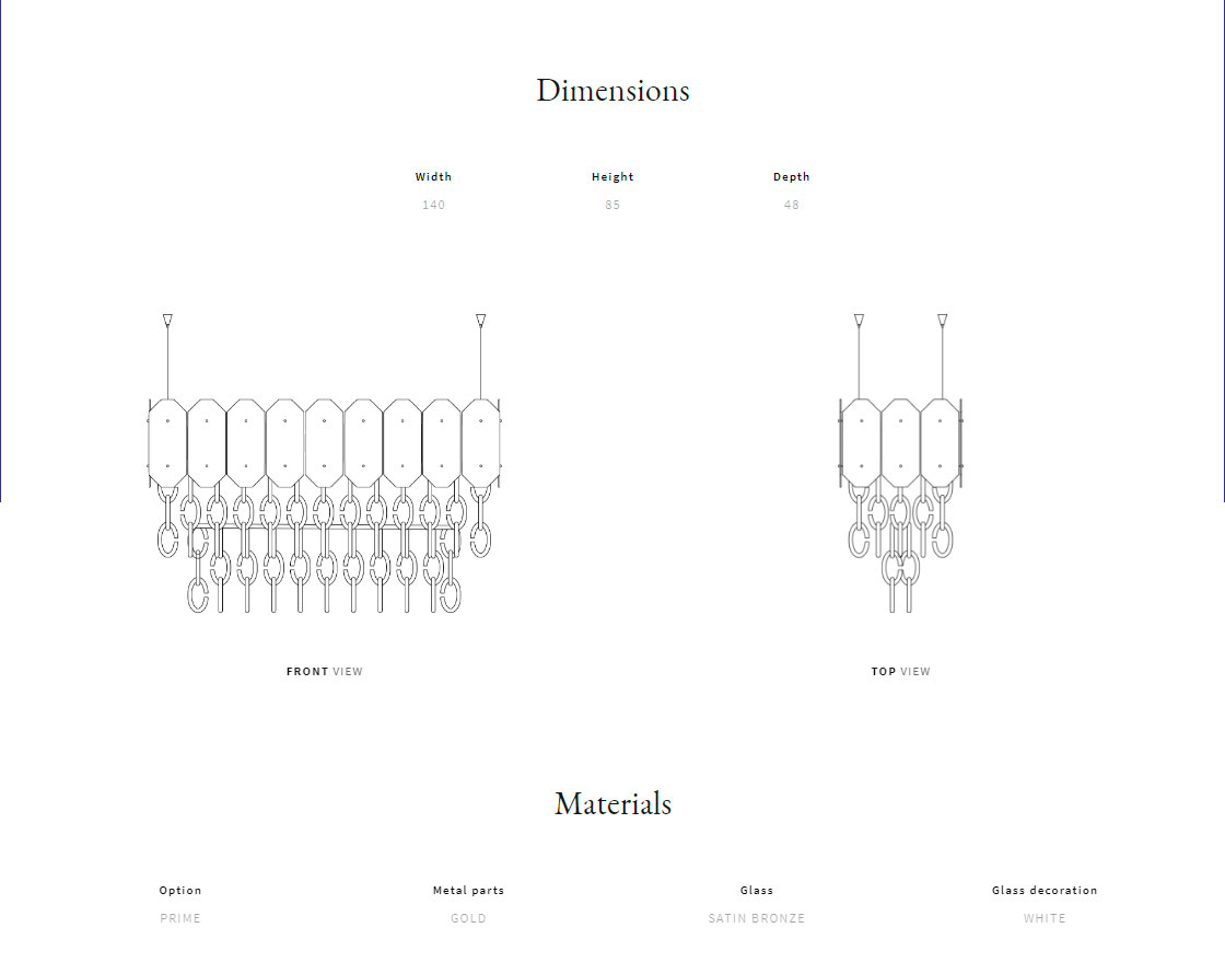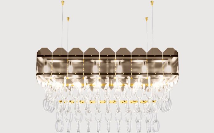 Металлический каркас. Геометрические стеклянные абажуры цвета сатинированной бронзы. Декоративные элементы цепочки из рифленого муранского стекла. Светильник имеет стальные провода и элементы для потолочного крепления.