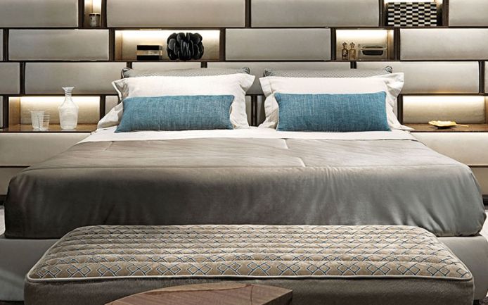 Простыни из 100% льна натурального цвета соли и перца. Верхняя простыня с соответствующей вышивкой Visionnaire. Наволочки с рюшами с 4-х сторон. Покрывало с прямыми углами и прямоугольным стеганым блоком и голубовато-серой бархатной каймой. Подкладка из 100% хлопка.