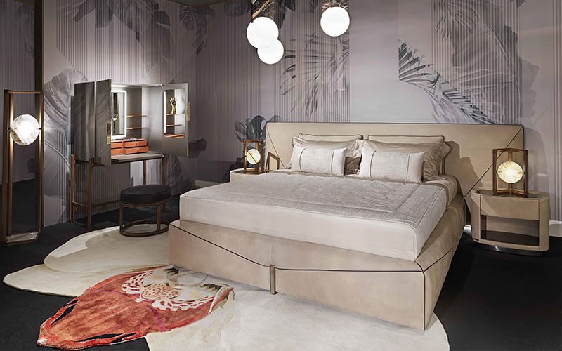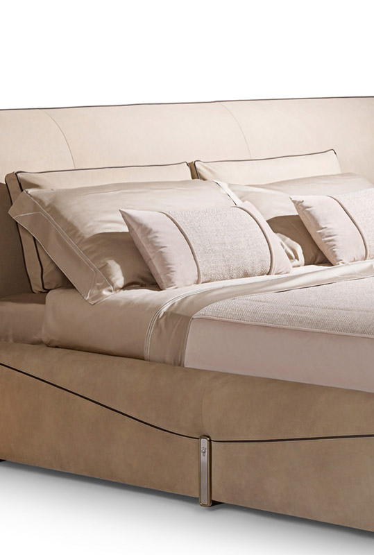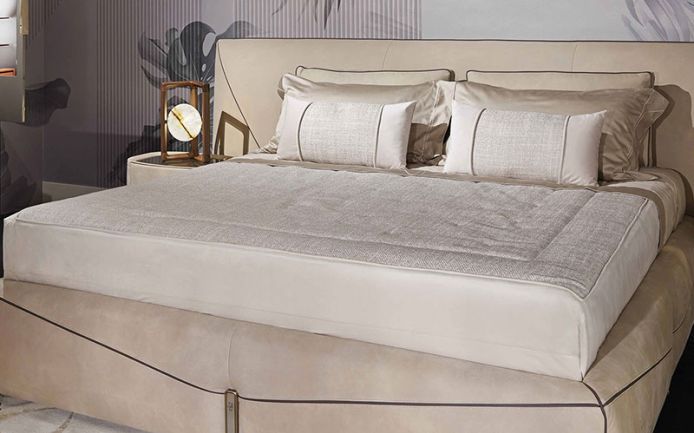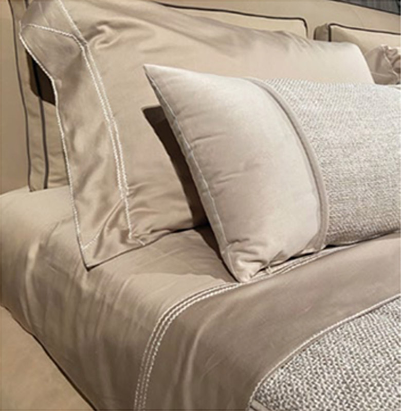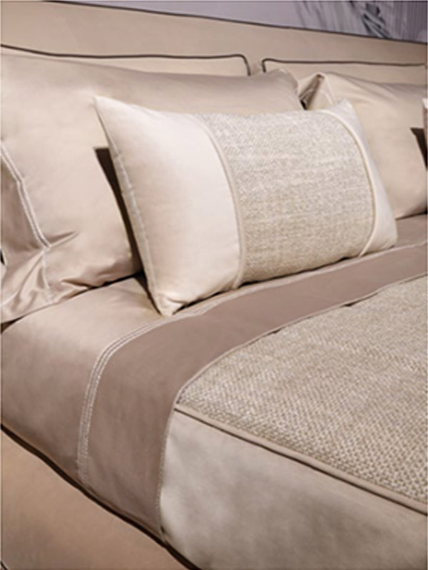 Простыня из 100% хлопкового сатина бисквитного цвета. Верхний край простыни и две оборки наволочки, вышитые аппликацией из крупной пряжи из узорчатой ткани для покрывала, логотип Visionnaire на верхнем листе, тон в тон. Покрывало с прямыми углами, стеганые штрихи расположены ромбовидным узором, окантовка по периметру. центральная часть из грубой нити Papyrus Natural песочного цвета, окантовка из бархата, с 3-х сторон обшитые края бархатом бежевого/песочного цвета. Подкладка из 100% хлопка однотонного цвета.