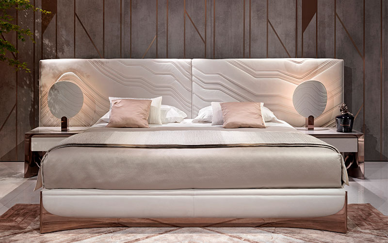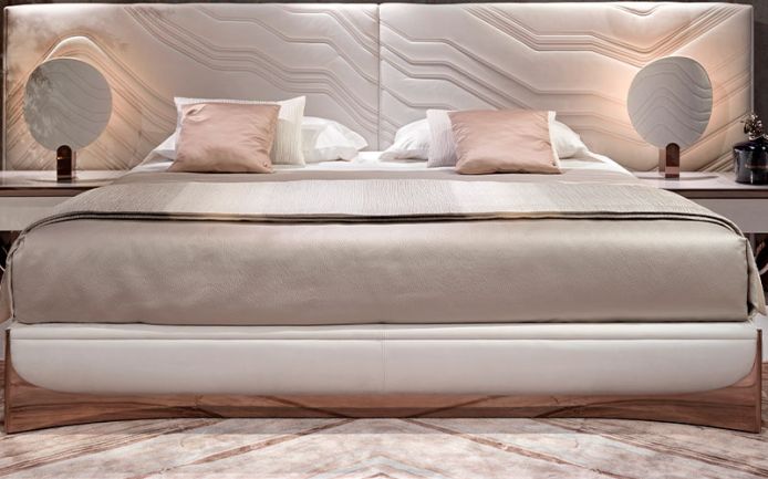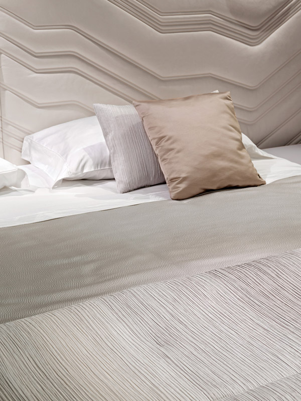 Сатиновые простыни из 100% хлопка натурального белого цвета. Вышивка Ca' Foscari по краю верхней простыни и на двух рюшах наволочек. Логотип Visionnaire, вышитый по краю простыни, тон в тон. Покрывало с прямыми углами, стеганое с ромбовидными зигзагами по краю по периметру. 100% полиэстер сатин с эффектом чеканного рельефа, жемчужно-серый цвет Oyster. Подкладка из 100% чистого хлопка. Второе покрывало из ткани с двусторонним плиссированным эффектом, жаккардовой обработки, напечатано в градиенте серого цвета от естественно-белого до жемчужно-серого.