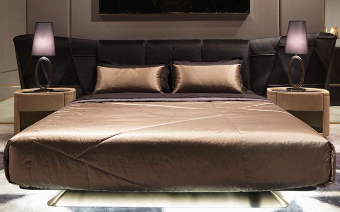 100% черный хлопковый сатин. Верхний лист с черной плиссированной окантовкой из тафты с вышитым логотипом «V». Наволочки с 3-х сторон окантованы плиссированной тафтой тон в тон. Покрывало с прямыми углами и диагональной треугольной простежкой, из 100% полиэфирного сатина с добавлением металлизированной нити, цвет серо-коричневый. Подкладка из чистого хлопка.