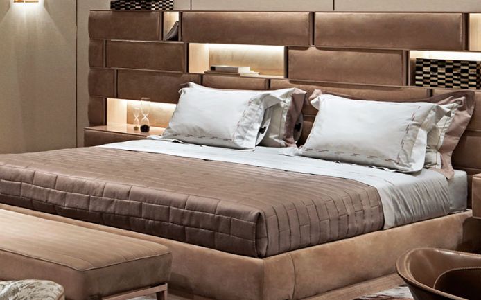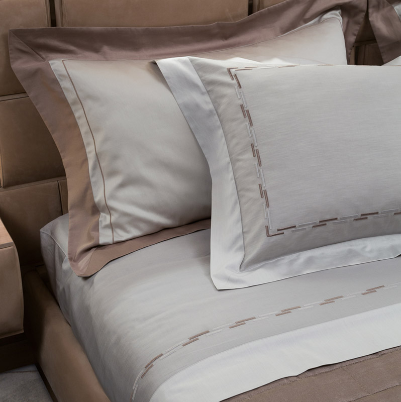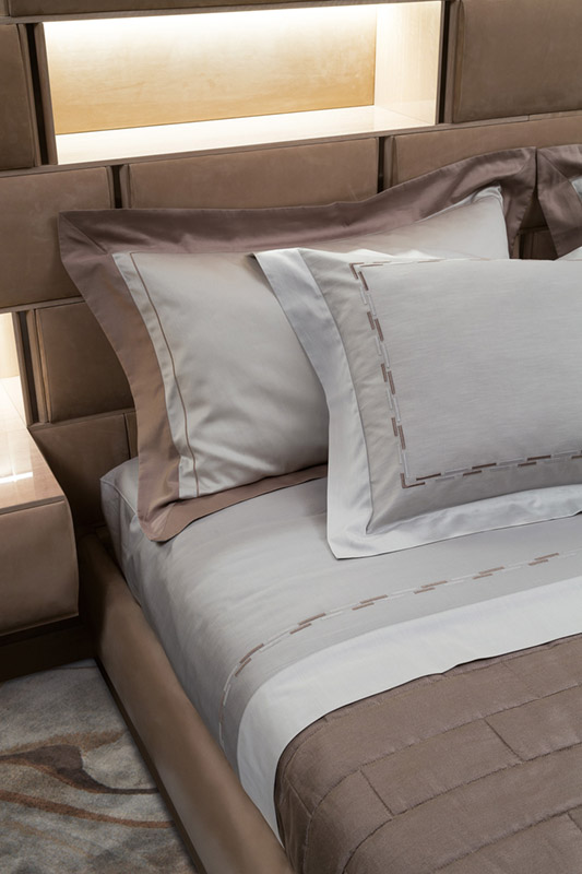 Простыня из 100% хлопкового атласа голубовато-серого цвета с полосой ленцуоло сверху и 4 каймами на наволочках контрастного натурального белого цвета. Двухцветная греческая вышивка голубовато-серого/белого цвета на наволочке и простыне. Покрывало из 100% льна цвета лесного ореха с узором из стеганой кирпичной кладки. Подкладка из чистого хлопка. Двустороннее основание кровати из ткани с дамасским эффектом мятного/белого/белого цвета.