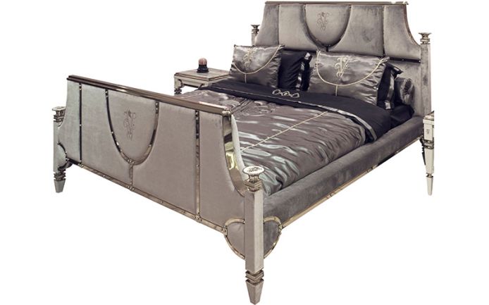 100% черный хлопковый сатин. Верхняя простыня с дымчато-серой блестящей атласной каймой. Логотип V", вставленный в дизайн цепочки, украшенный вышивкой кристаллами Swarovski в тон. Наволочка с 2 боковыми рюшами с дымчато-серой блестящей атласной тесьмой. Покрывало с прямыми углами из блестящего атласа дымчато-серого цвета, стеганое с центральным макро-логотипом "V" и штрихами, расположенными в ромбовидном узоре. Декоративные вертикальные полосы с аппликацией из золотой люрексовой тесьмы.