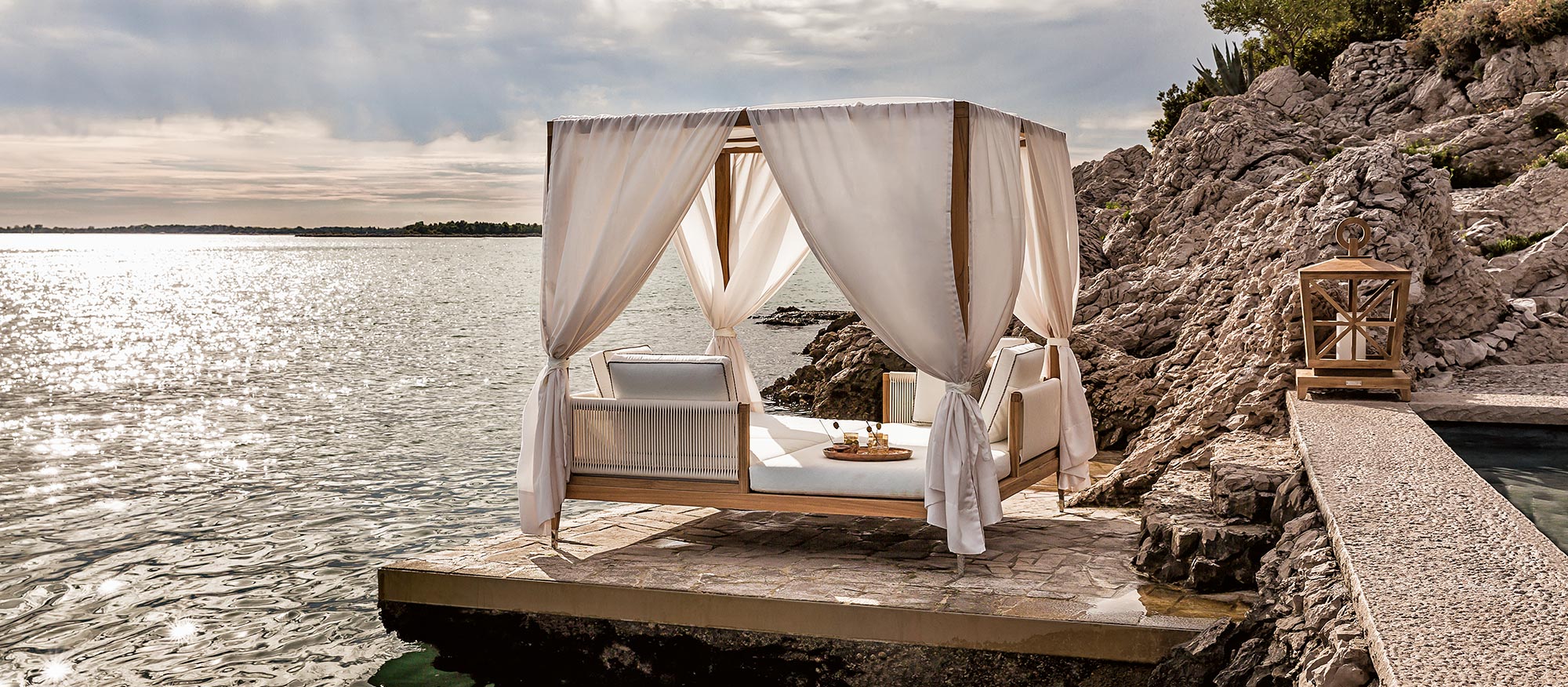Amalfi - это навес для эксклюзивных уединений, изысканные блюда, которыми можно поделиться в спокойной атмосфере. Все передает мягкость и воздушность: от мягких подушек до изящных штор, это роскошная конструкция, в которой есть все удобства.