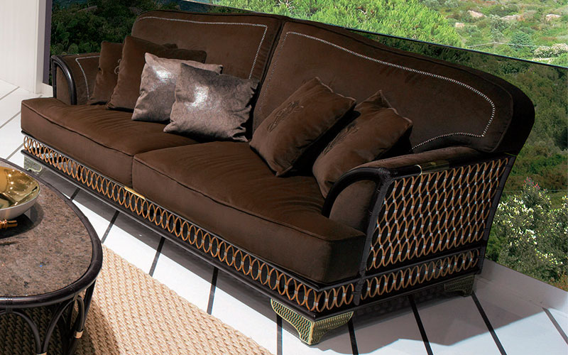 Опорная рама из натурального ротанга, кожаный переплет и металлические ремни из полированной нержавеющей стали с выгравированной геральдической символикой Visionnaire. Каркас сиденья из водостойкой фанеры.