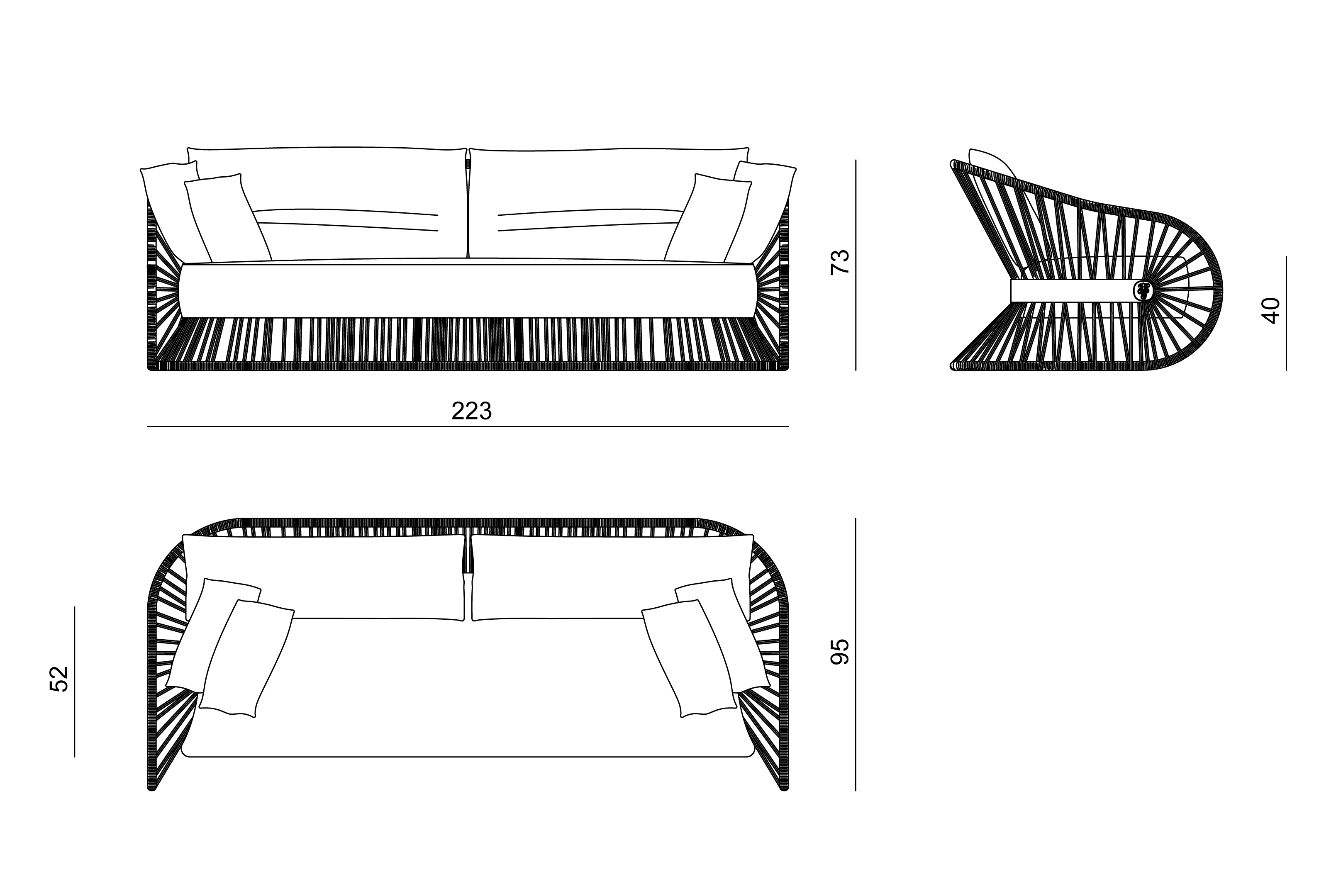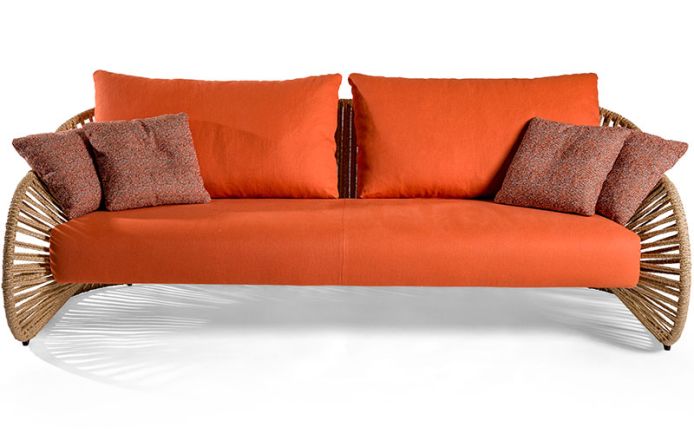 Диван и кресло с обивкой из кожи или ткани для улицы, металлический каркас с гальванизированной отделкой с порошковым напылением; эластичные ремни для упругости сиденья; плетение из натуральной пеньковой веревки, золотых и серебряных нитей с люрексом.