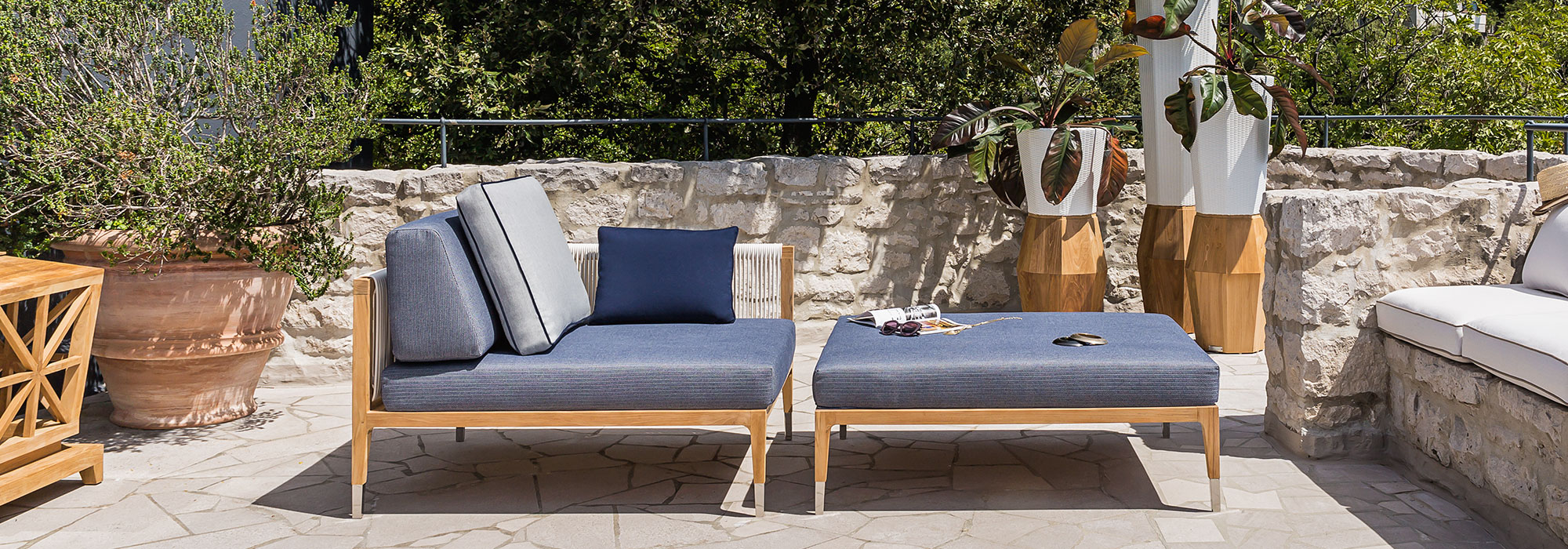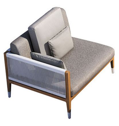 Правый угловой диван со структурой из тикового дерева, деталями из политеха и полированной стали, подушки сиденья и спинки со съемным чехлом и 1 подушка с пришивкой по краям (60 × 50 см).