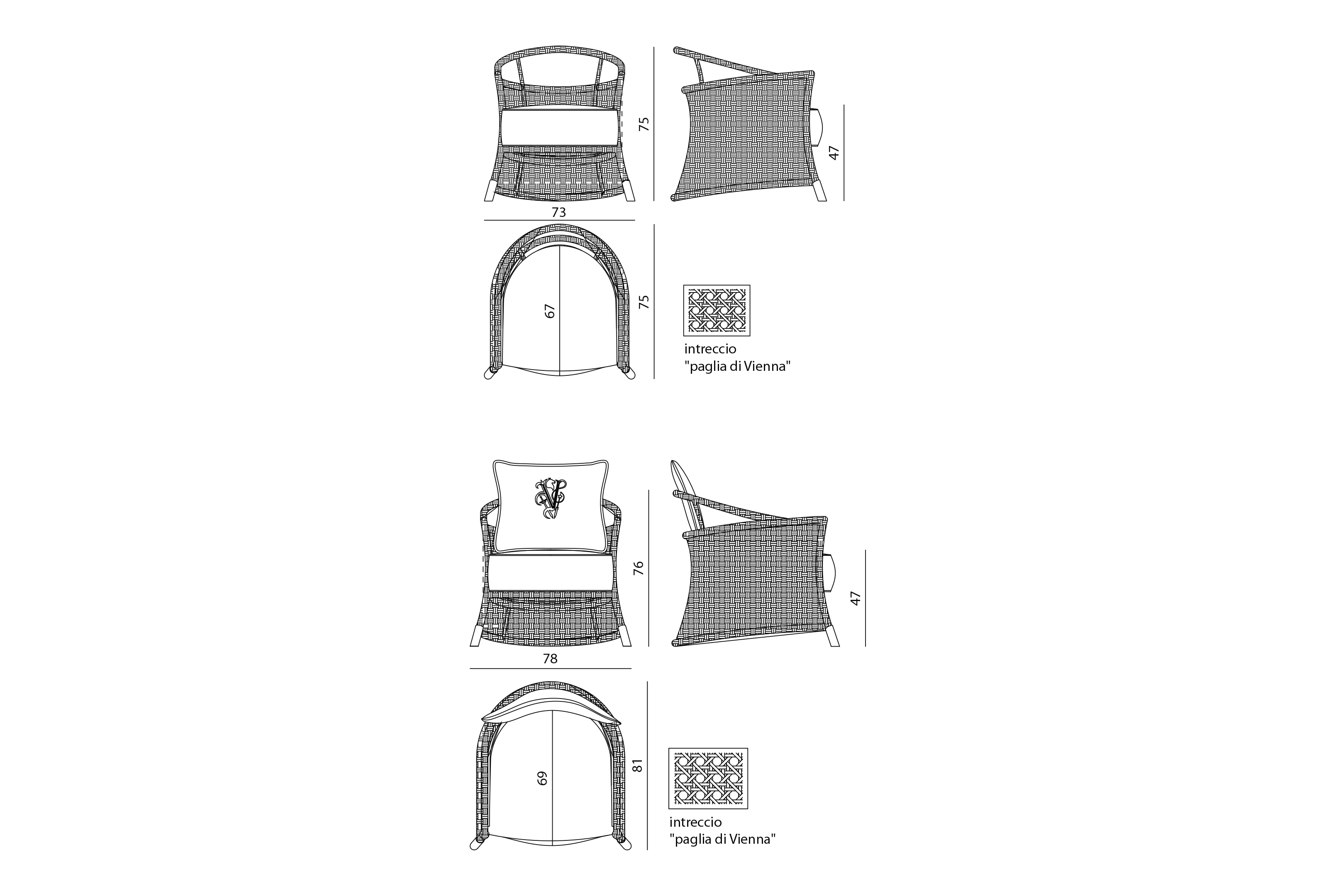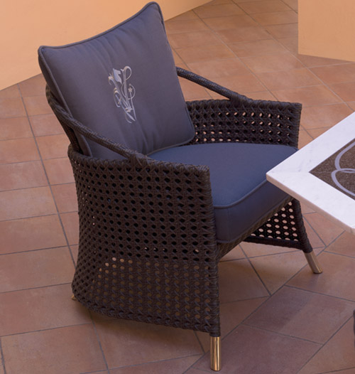Кресло из плетеного вручную синтетического ротанга с плетением "Венская солома" на алюминиевом решетчатом каркасе. Ножки из полированного алюминия с защитной прозрачной краской доступны в металлической отделке. Сиденье с наполнением из полиуретана и акриловой прослойкой.