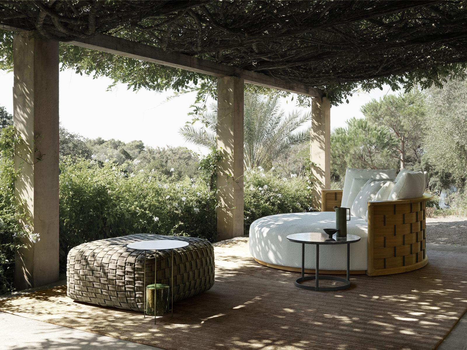 Взаимодействие между двумя коллекциями усиливается в удобном пуфе двух размеров с тканевой текстурой, дополняющем предложение аксессуаров коллекции.