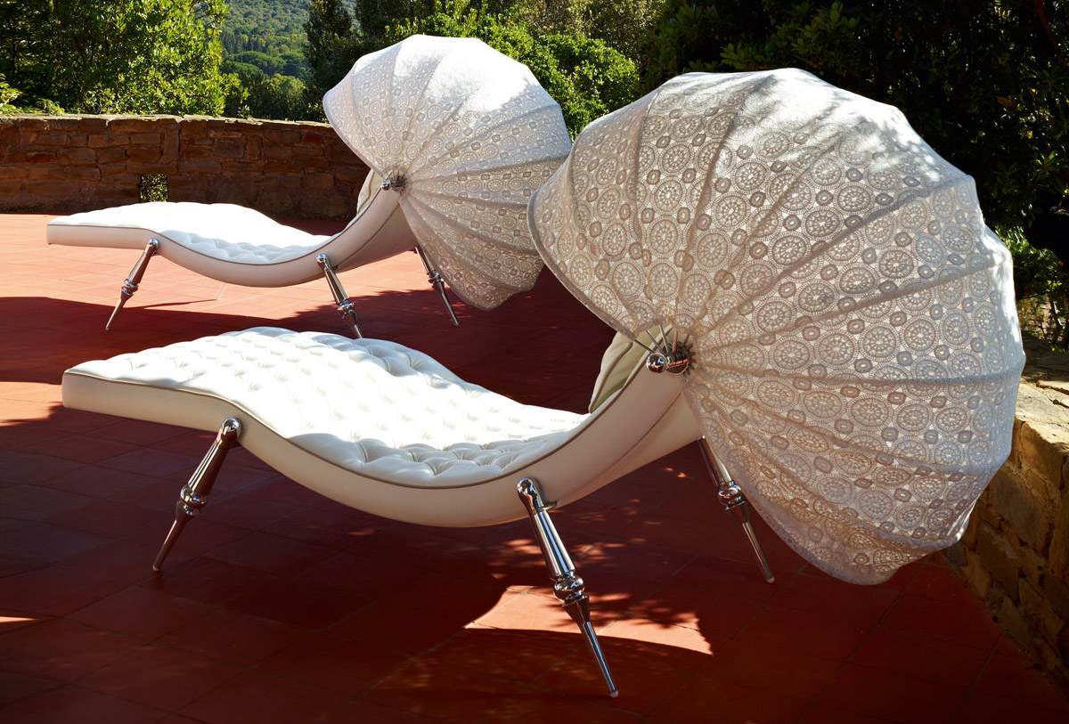 Каркас из фанеры из тополя с металлической опорой для крепления ножек. Набивка из полиуретана двойной плотности. Матрас декорируется капитоне. Внешний профиль из жесткого полиуретана. Подушка-подголовник 60x30 см с набивкой из пера, дополненная кантом и фиксирующими лентами.