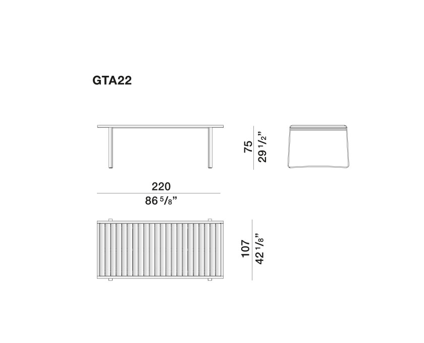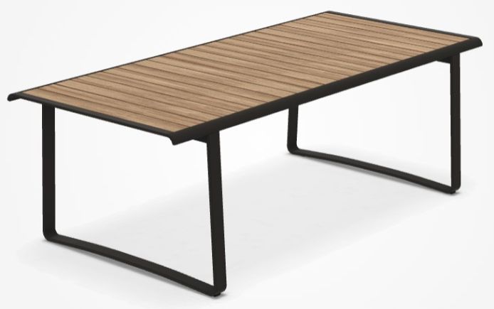 Обеденный стол Golden gate интерпретирует архетип уличных столов с решетчатой столешницей для отвода воды. Рассчитанный на 6 или 8 человек, он отличается тщательно выверенными пропорциями и выбором материалов. Столешница доступна в двух вариантах: из цельных планок из тикового дерева или из плит из лавового камня.