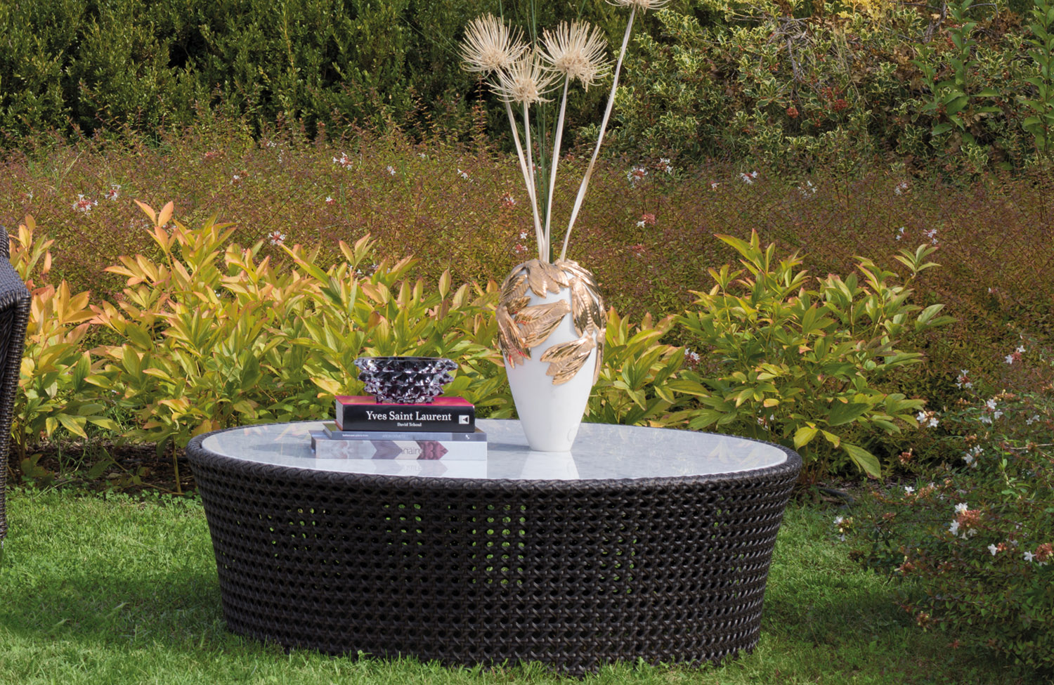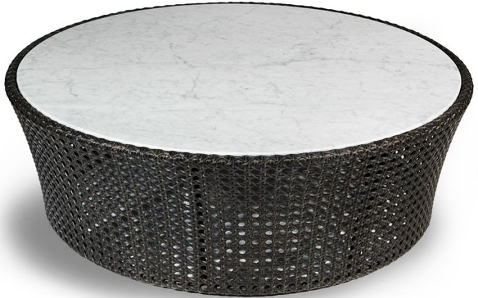 Низкий круглый столик из синтетического ротанга с ручным с плетением "венская солома" на алюминиевой решетчатой раме. Мраморная столешница. Синтетический ротанг доступен в цветах белого золота, медового золота и бронзы.