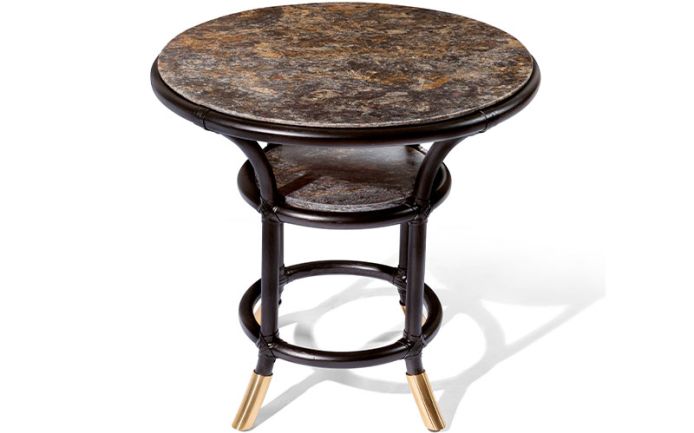 Несущая конструкция из натурального ротанга, кожаное плетение. Верхняя и нижняя столешница из гранита. Декоративные трубчатые металлические элементы доступны в металлической отделке.