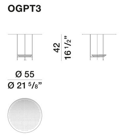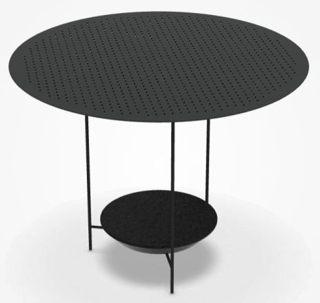 Стол Panna Cotta имеет каркас из нержавеющей стали, основание противовес из лавового камня и стальную столешницу с перфорированным верхом.