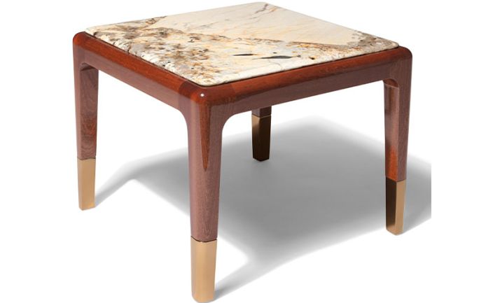 Уличный стол из красного дерева, доступен в глянцевой или матовой отделке. Конструкция из вырезанных из массива красного дерева фигурных элементов с закругленным краем; полированные ножки из нержавеющей стали AISI 316 конической формы.