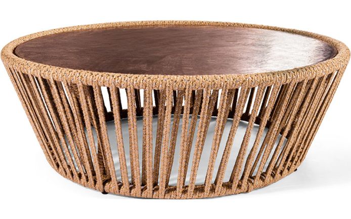 Низкий столик с металлическим каркасом из оцинкованного металла с порошковым покрытием; плетение из натуральной пеньковой веревки и золотых и серебряных нитей с люрексом. Антрацитовая столешница из лавового камня; эмаль, обжиг.