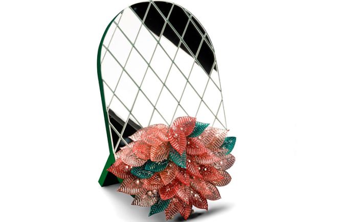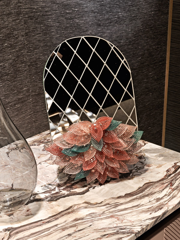 Настольные и настенные зеркала, изготовленные традиционными методами Мурано, с применением вырезанных и отшлифованных серебряных зеркал ручной работы и стеклянных листьев, нанесенных вручную.
