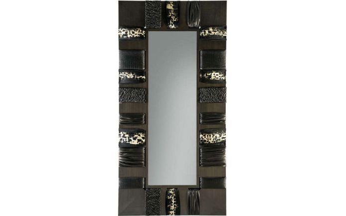 Каркас из многослойного дерева, обтянутого кожей или тканью из коллекции. Металлическая панель из латуни с отделкой из матовой темной бронзы. Натуральное, бронзовое или дымчатое зеркало.