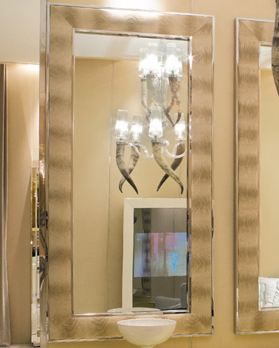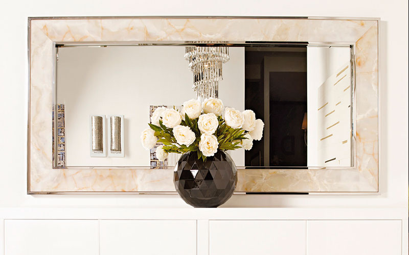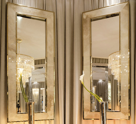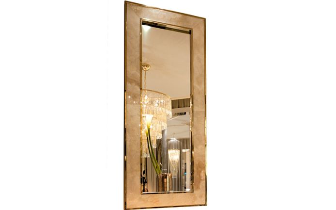 Каркас из МДФ, покрытый полированной нержавеющей сталью, толщина 15,5 мм. Безопасное зеркало для предотвращения несчастных случаев толщиной 5 мм. Рама толщиной 15 мм из мрамора или дерева в обивке кожей или тканью.