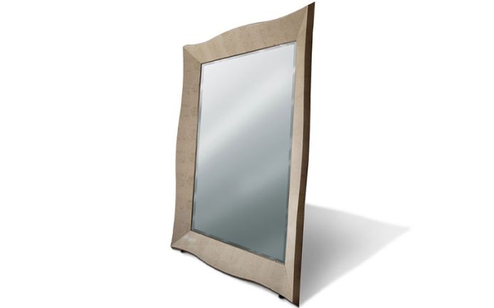 Напольное зеркало из комбинации кожи с тиснением под броненосца и зеркала со скошенной кромкой. Внешняя рама из кожи с принтом броненосца.