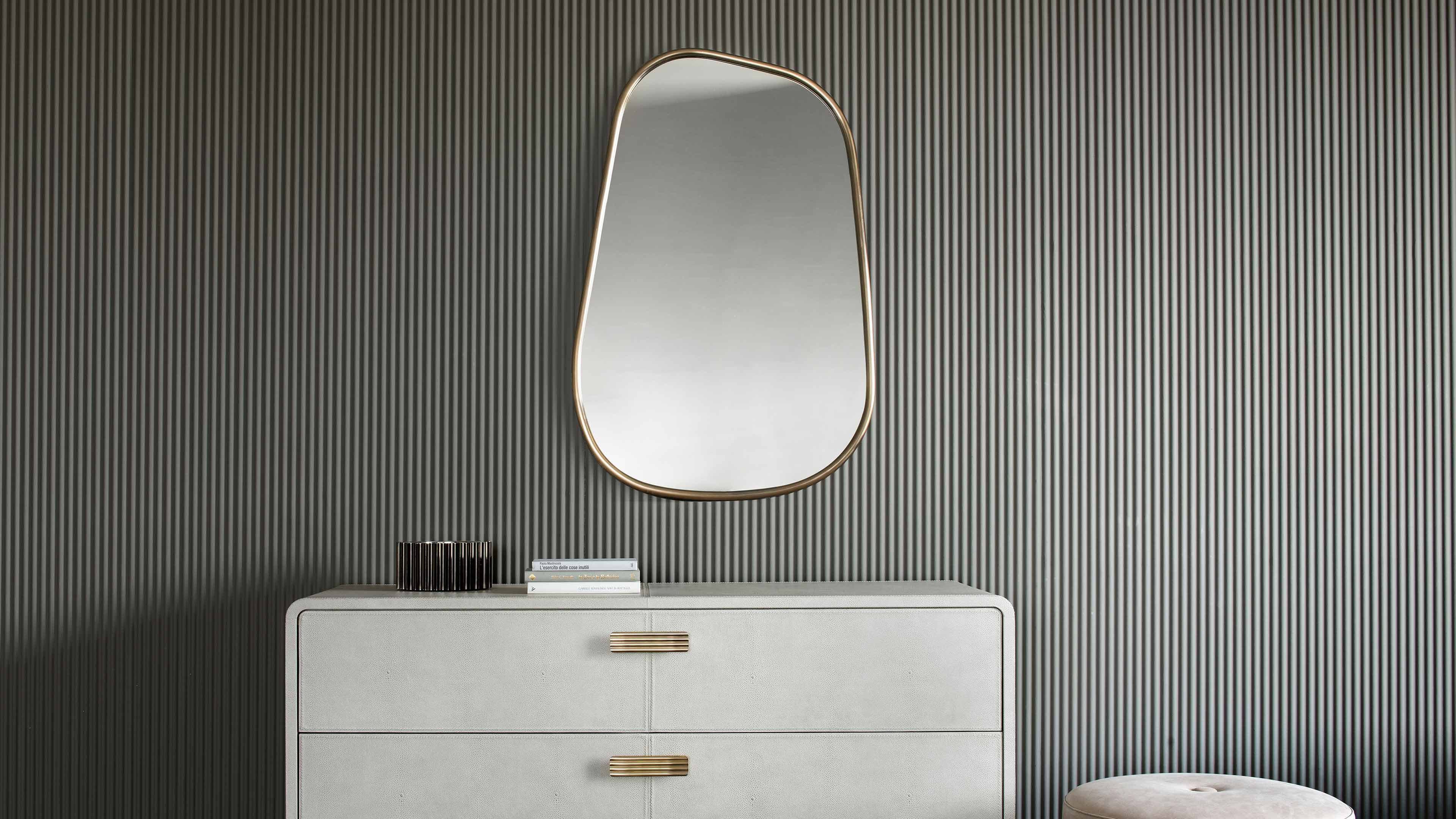 Для коллекции зеркал неправильной формы бронзовая рама слегка закруглена.