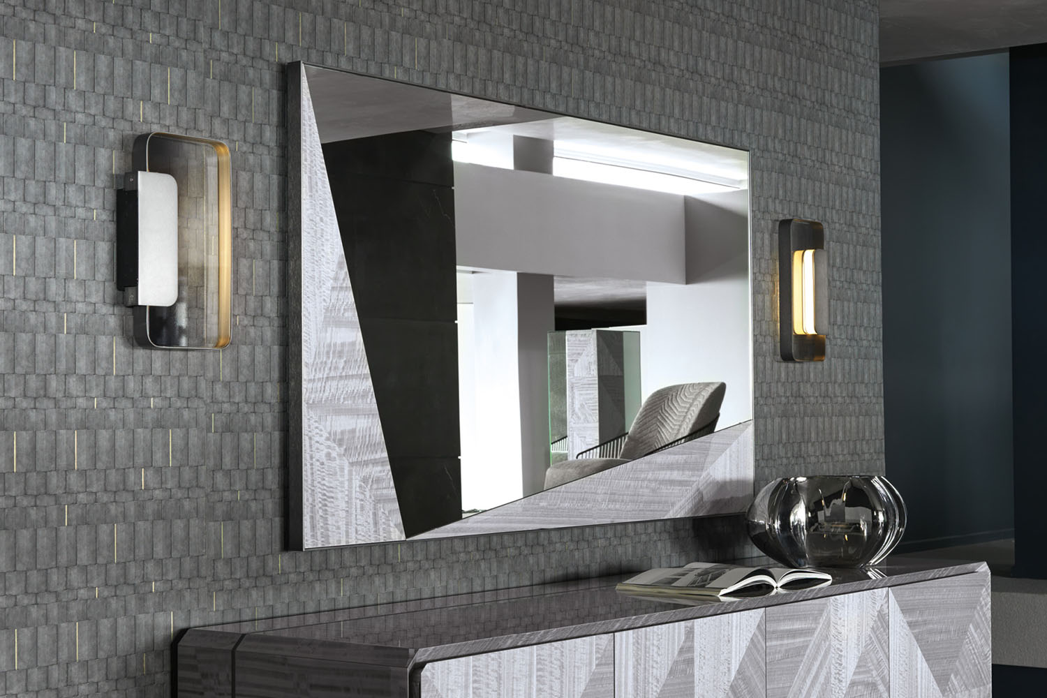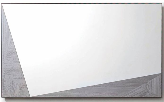 Прямоугольное зеркало со вставками из инкрустированного шпона тасманийского эвкалипта с глянцевой отделкой. Рама из никелированной нержавеющей стали матового серого цвета.