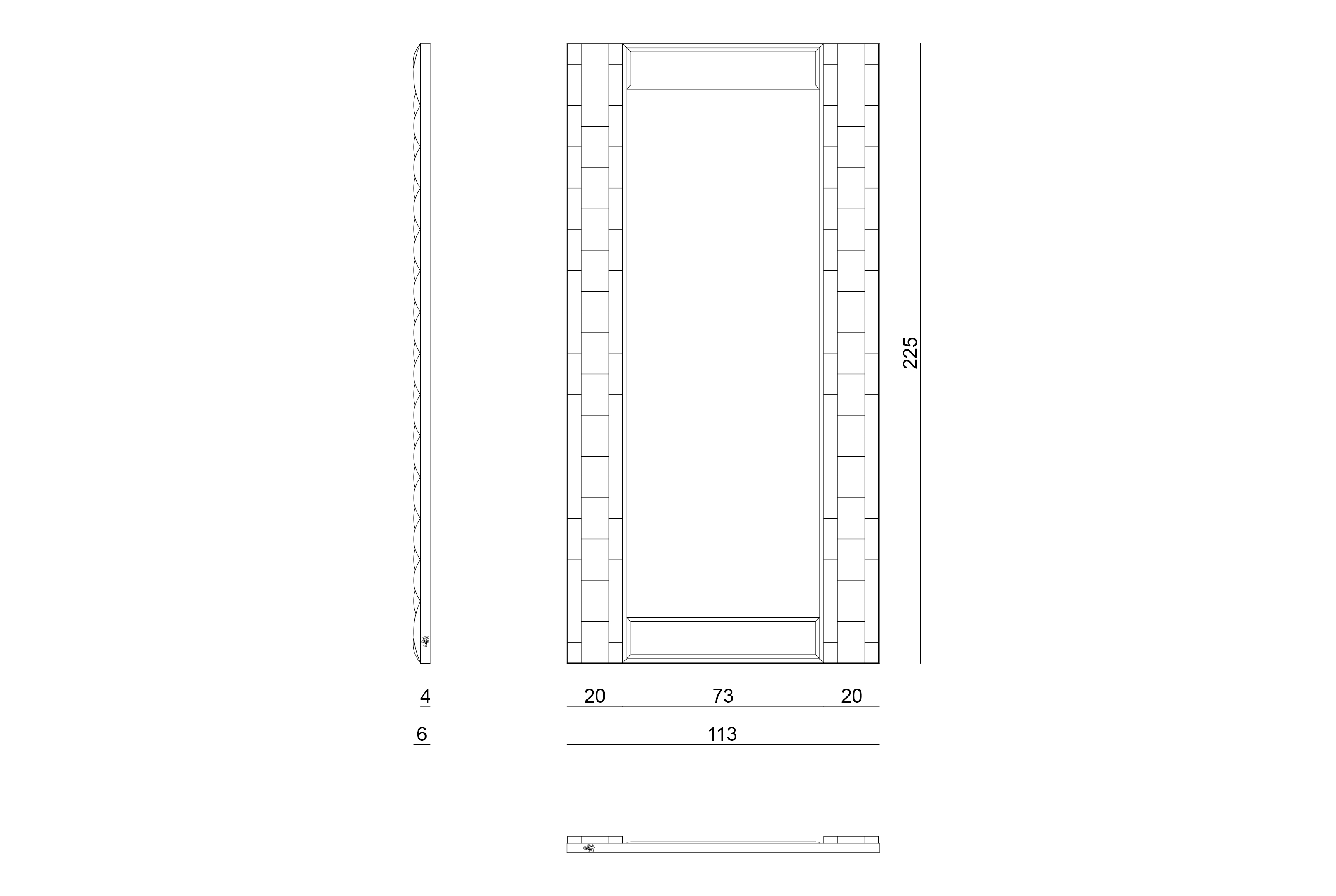 Рама зеркала состоит отдельных мягких плиток в обивке из кожи или ткани, что напоминает ремешок для часов. Внешний периметр рамы выполнен из полированной нержавеющей стали.