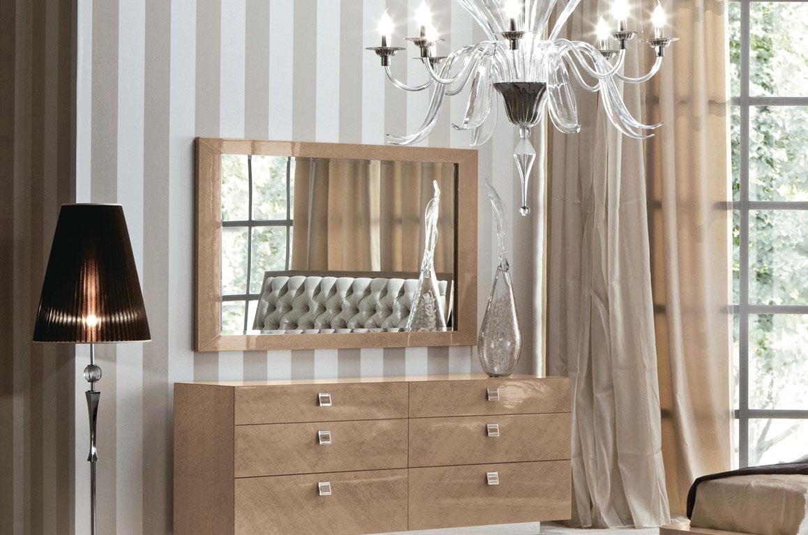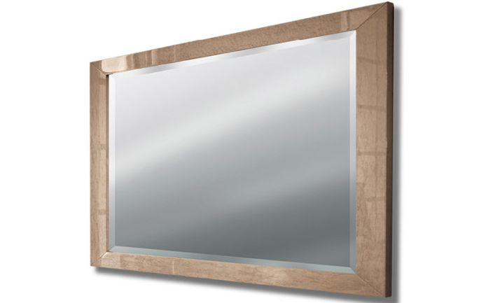 Зеркало со скошенным краем, отделанное шпоном клена цвета шампанского с глянцевым покрытием.