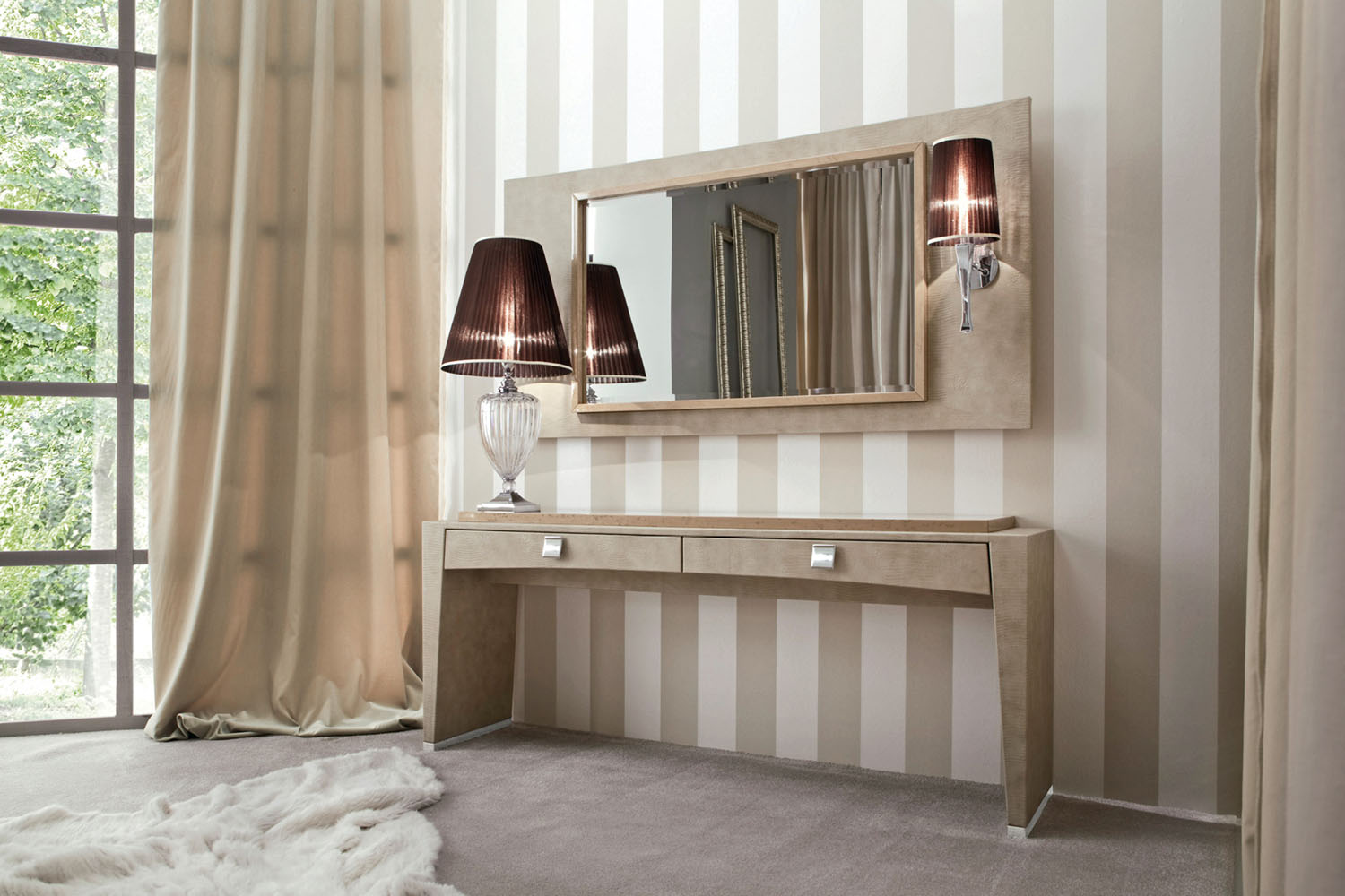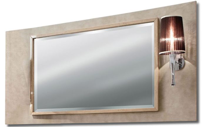 Зеркало в кожаной раме со светильником, в комбинации шпона клена цвета шампанского и кожи с принтом игуаны.