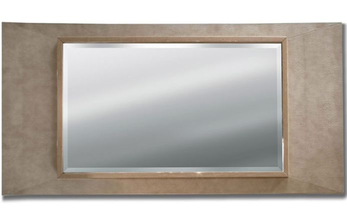 Зеркало в кожаной раме со светильником, в комбинации шпона клена цвета шампанского и кожи с принтом игуаны.