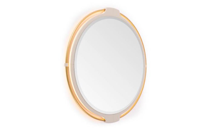 Круглое зеркало коллекции Vine характеризуется наличием металлического кольца в отделке сатинированное золото, которое обрамляет его окружность, а обтянутая кожей конструкция практически обнимает этот металлический круг. Зеркало оснащено внутренней светодиодной подсветкой. Круглое зеркало Vine доступно в различных вариантах отделки в соответствии с образцами.